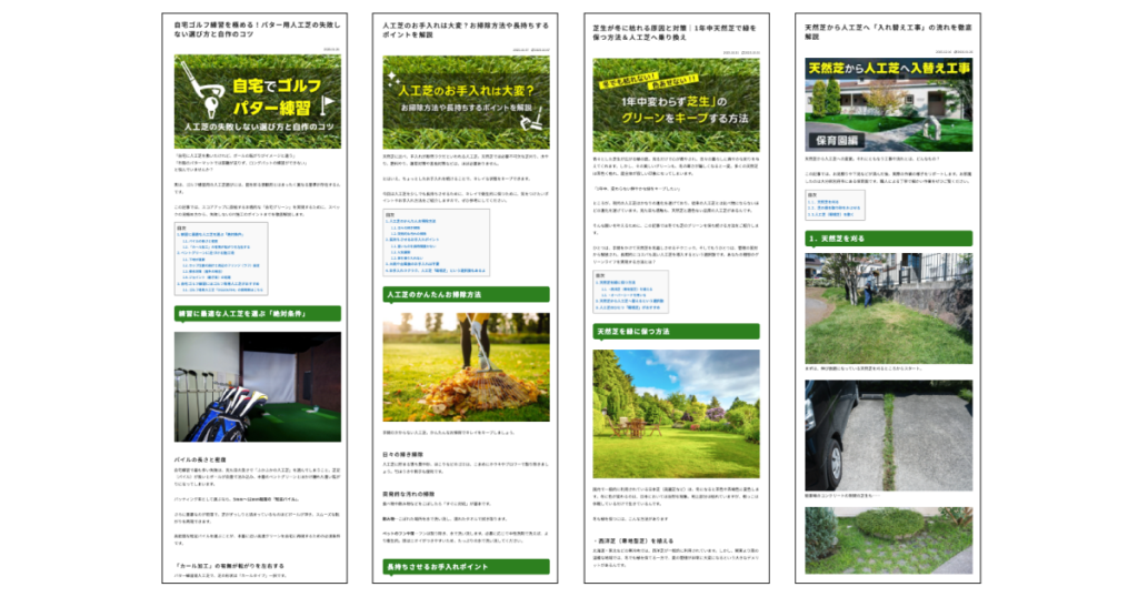 SEO対策としてブログ記事を掲載したり、MEO施策をしたりする前の対面営業では、人工芝の現物や資料をお見せして説明をしていました。でも、その短い時間だけでは説明不足になる部分も多かったんですよね。