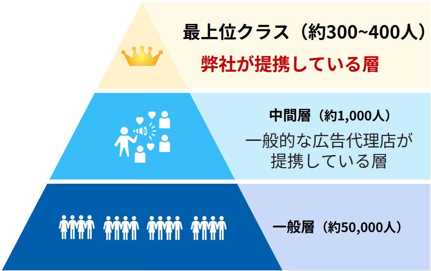 一般的な代理店が提携する中間層ではなく、最上位クラス(約300~400人)のインフルエンサーと直接契約/交渉が可能です。